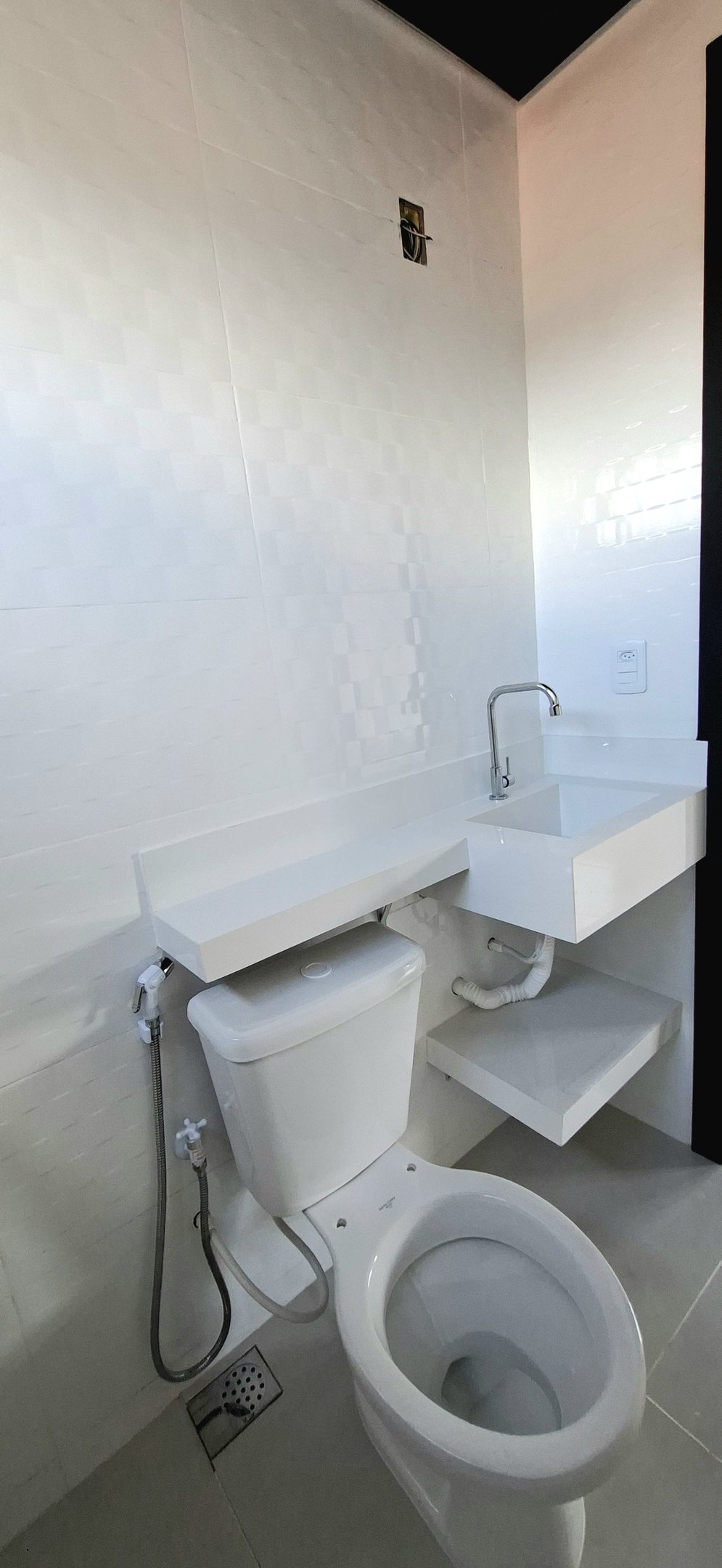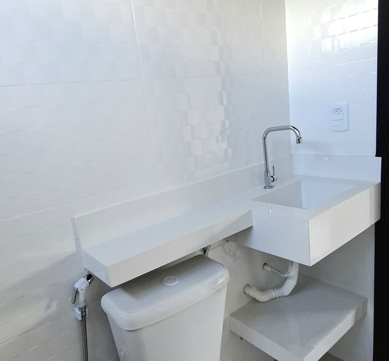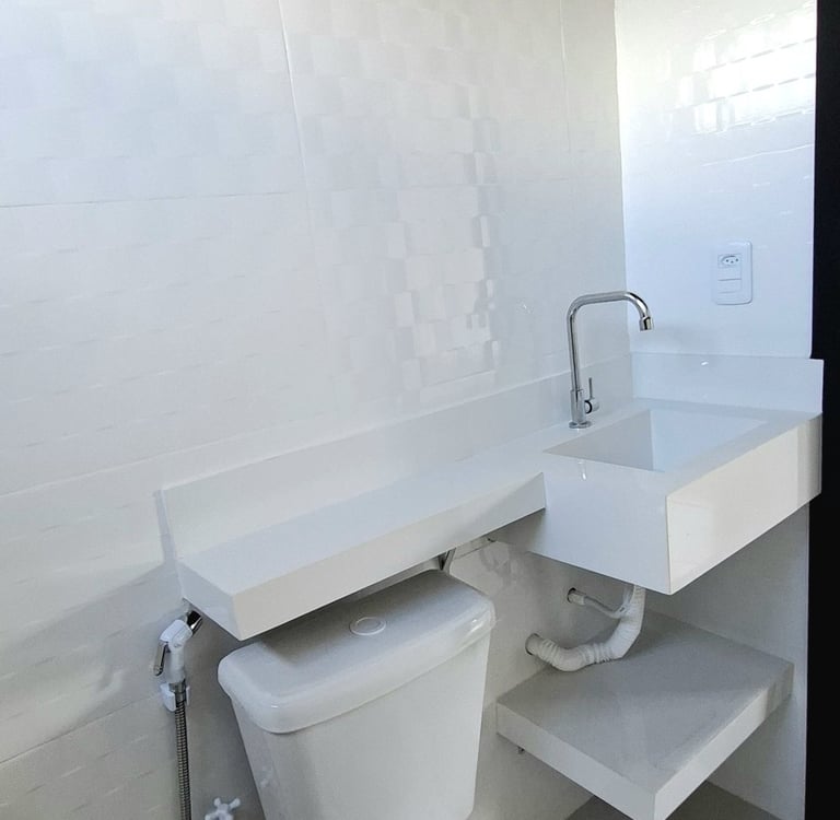 Banheiro com excelente acabamento, design moderno e pia esculpida sob medida. Elegância e praticidade em cada detalhe.
